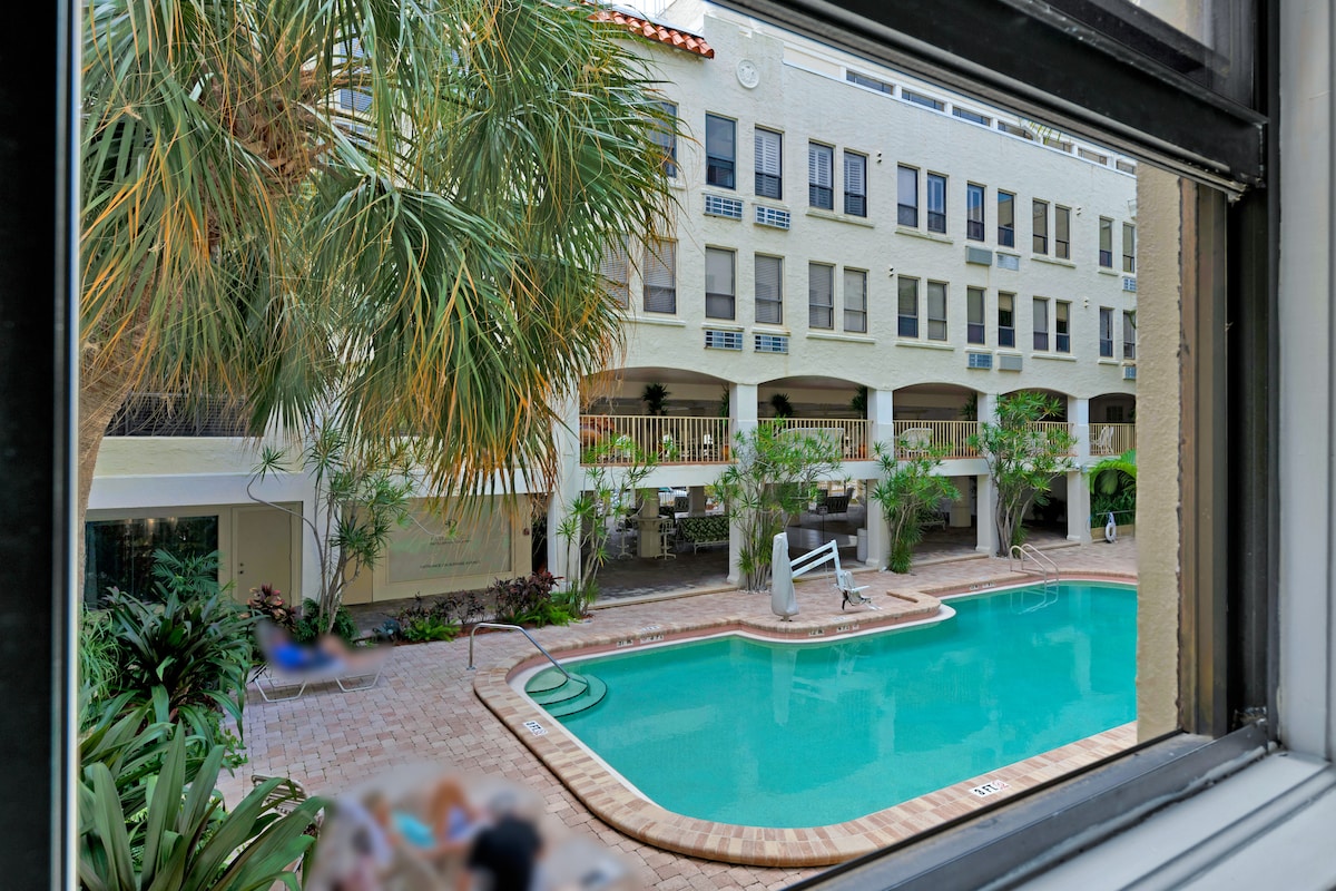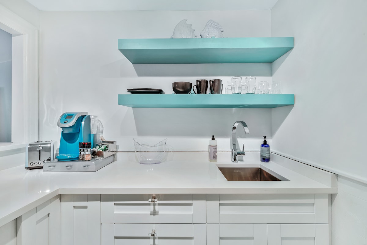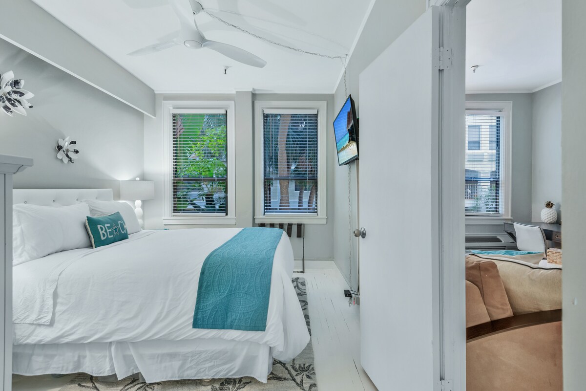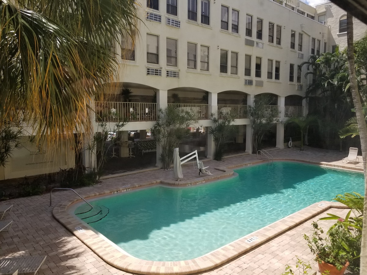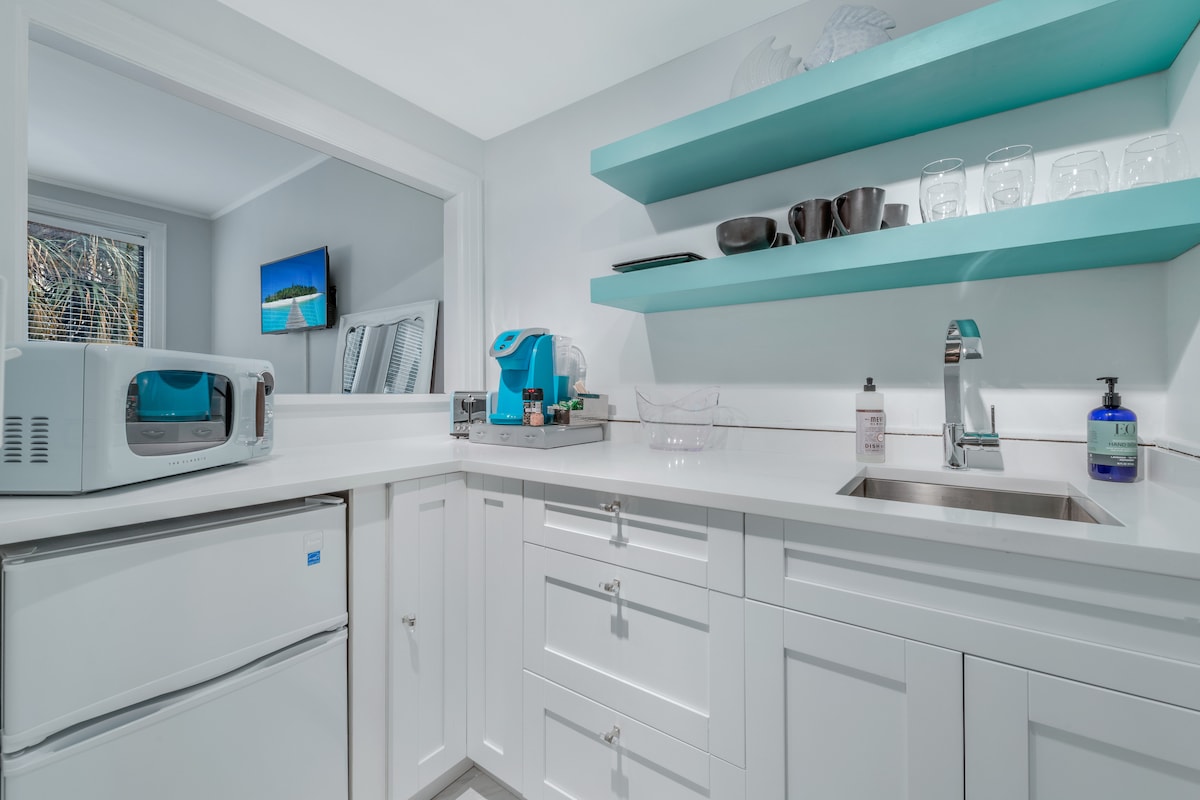 The spaceWalk to the beach from this newly updated 400SF one-bedroom condo with Queen Simmons Black Label beauty rest bed and deluxe pull out queen sofa bed in living room for two additional guests! The space is equipped with a kitchenette, living room, bedroom and bathroom. Coffee table is modular and converts to a dining room table. There's no need for a car. Gourmet restaurants, spas, shops & bike trails close. Located in the heart of the Town of Palm Beach 2.5 blocks from the beach access. The beach is a short walk away and there is a Publix grocery store across the street. Included is a room safe, beach towels, beach chairs, beach umbrella, umbrella, soap, shampoo, conditioner and Keurig coffee pods